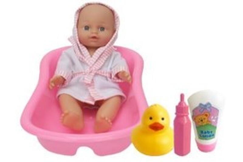 Incluye 5 accesorios: biberón, bañera, patico de hule, shampoo y talco.